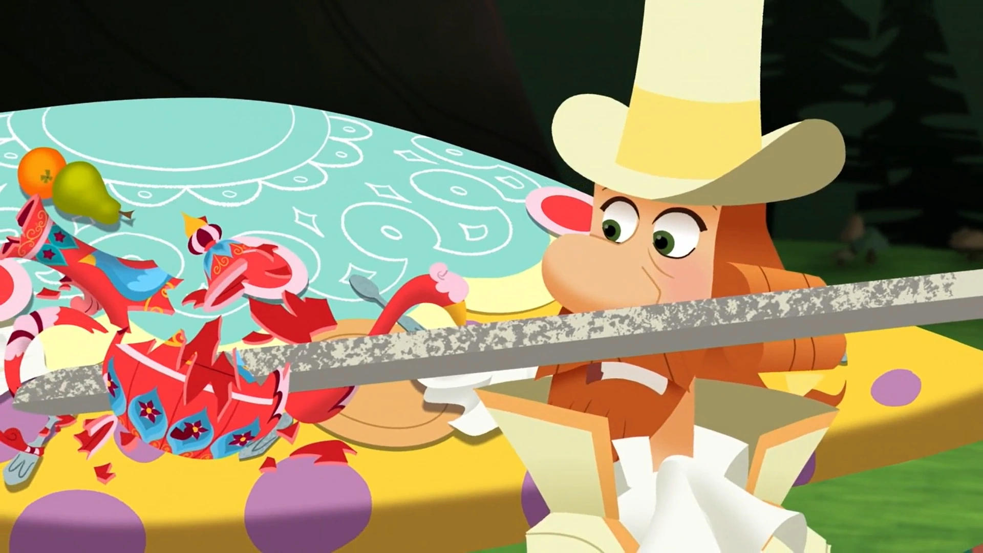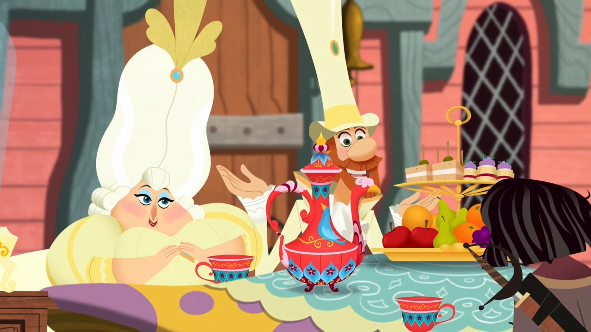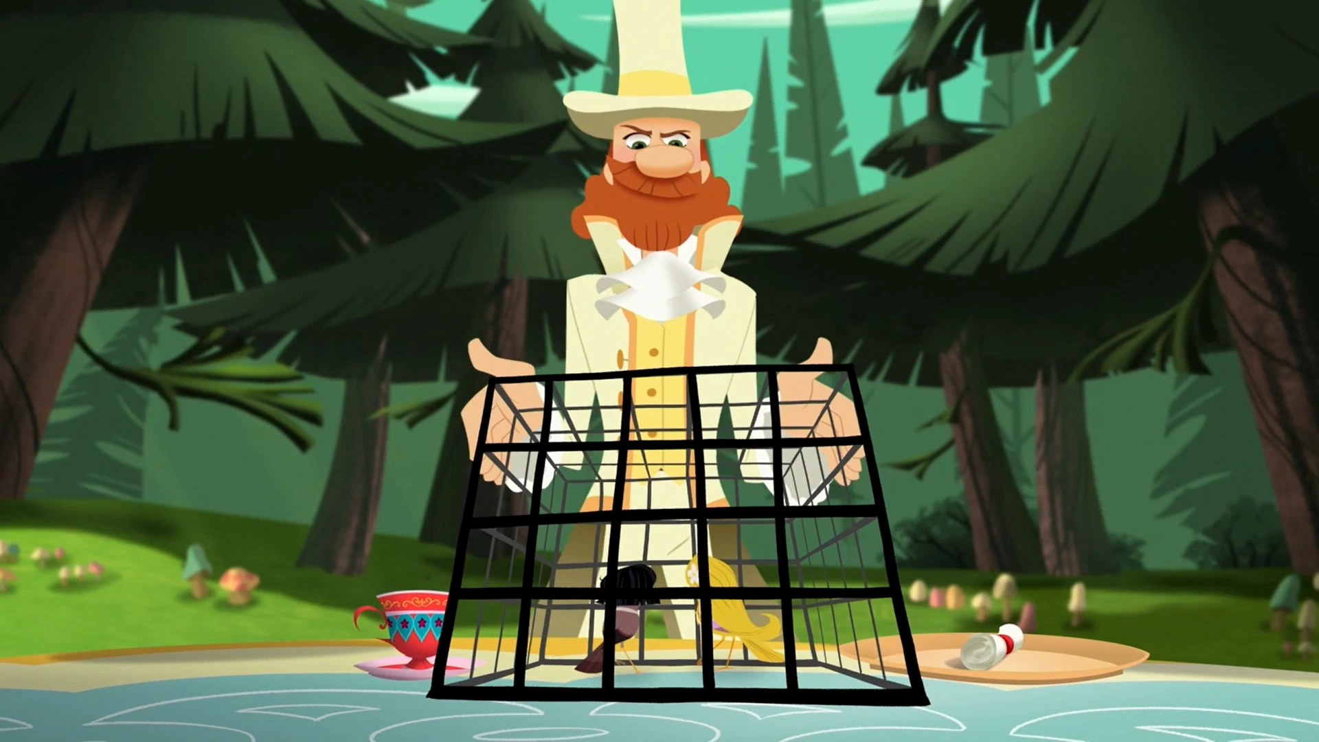 В лесу девушки находят полянку, на которой сидит пара странных людей, пьющих чай. Эти люди представляются как «Мать» и «Отец», после чего предлагают своим гостям попить с ними чай. «Мать» рассказывают им о том, что их чай необычный — он превращает людей в птиц. Рапунцель думает, что это шутка, но «Отец», к удивлению Рапунцель и Кассандры, превращается в птицу и предлагает им тоже попробовать стать летающими существами.